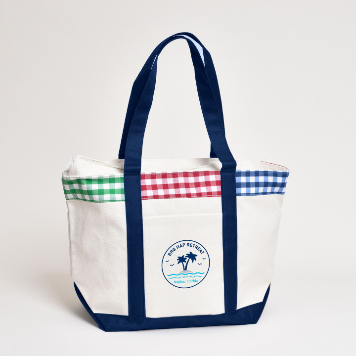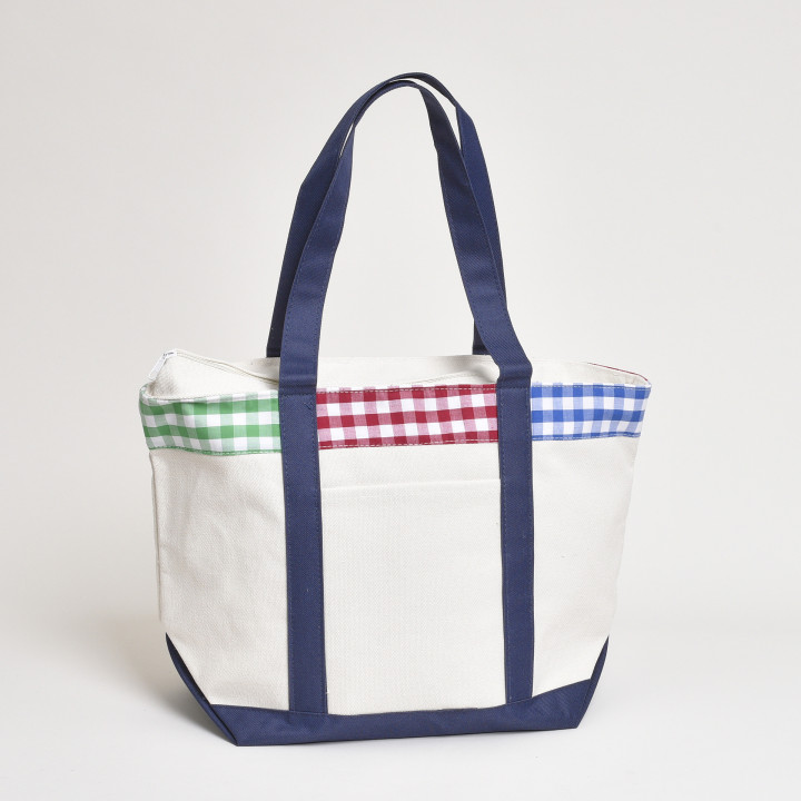 The Edgartown Tote is beautifully detailed with 22oz canvas and features coordinating gingham accents outside with mini check gingham lining. Large inside zip pocket along with three additional pockets will hold all of your belongings. Finally our extra long handles (11" drop) and zip top complete the perfect everyday tote.